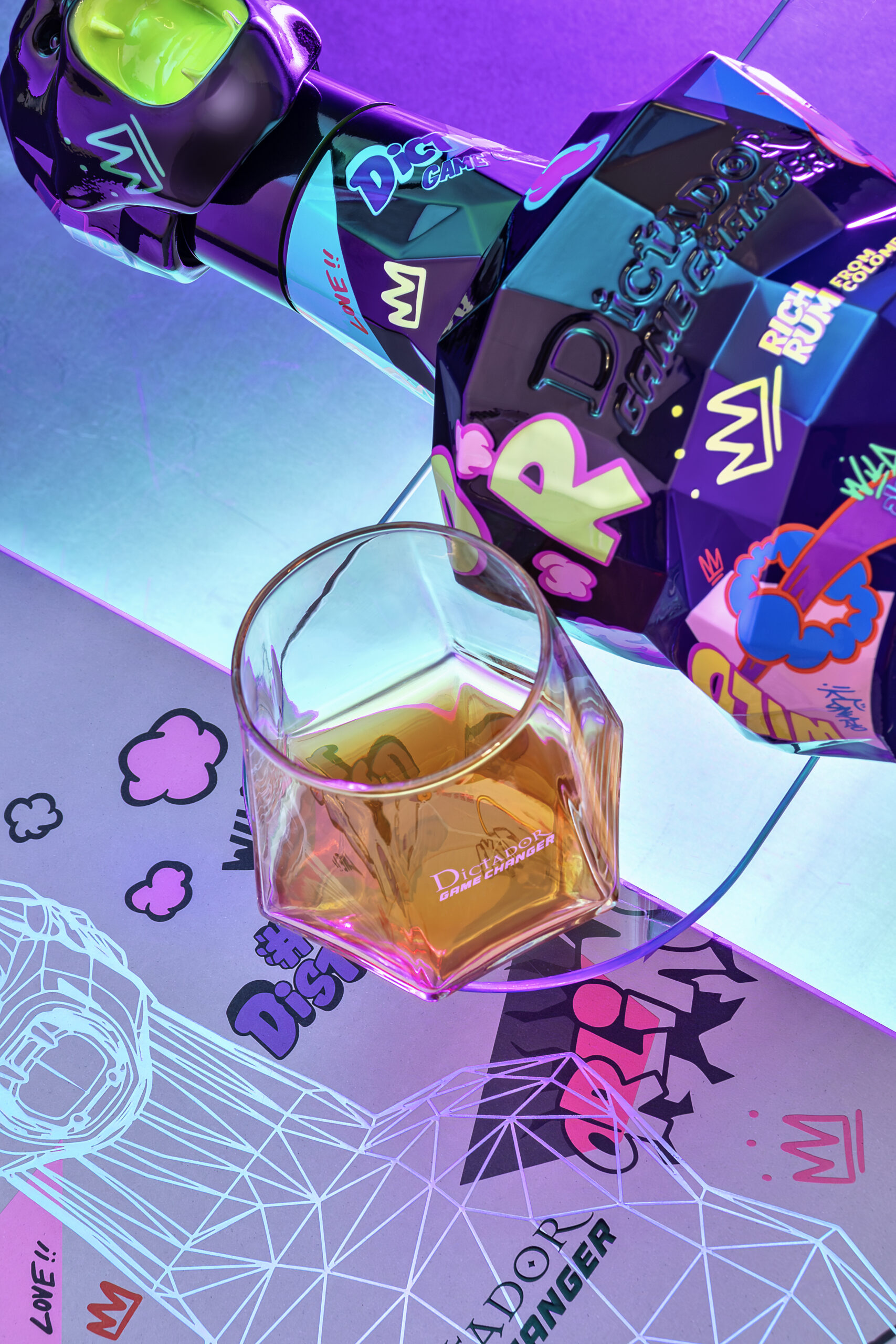 Each glass features a bold, geometric silhouette and a subtle iridescent coating that refracts light into a spectrum of soft hues. The result is a mesmerizing visual experience that enhances the deep amber glow of fine Dictador rum.