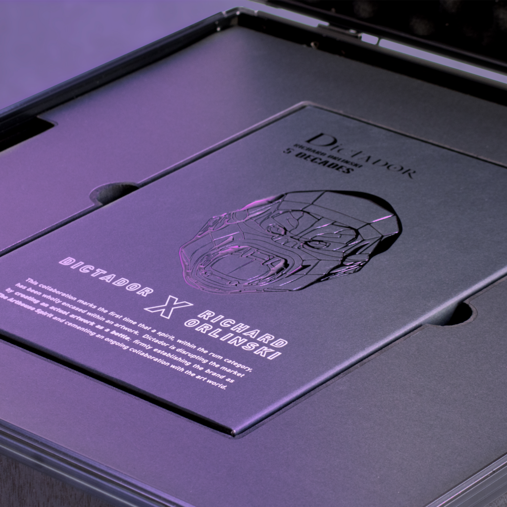 THIS COLLABORATION MARKS THE FIRST TIME THAT A SPIRIT, WITHIN THE RUM CATEGORY, HAS BEEN WHOLLY ENCASED WITHIN AN ARTWORK. DICTADOR IS DISRUPTING THE MARKET BY CREATING AN ACTUAL ARTWORK AS A BOTTLE; FIRMLY ESTABLISHING THE COMPANY AS THE ARTHOUSE SPIRIT BRAND AND CEMENTING AN ONGOING COLLABORATION WITH THE ART WORLD.